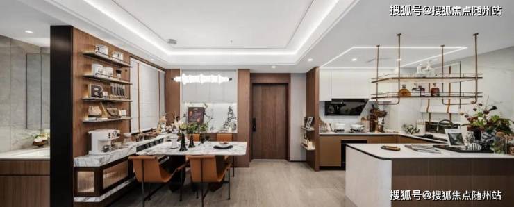 空间之外,便是高定的奢装。进门玄关处的水刀拼花地面,高级感拉满的玄关柜,都是交付标准。餐客厅大面积木饰面,全大理石地面,每一步都质感斐然;主卧墙面岩板和木饰面拼贴的背景,高级感满满。