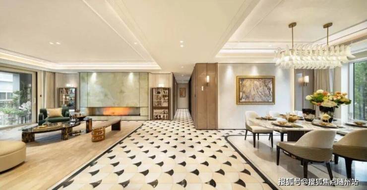 浩运府室内精装设计奢华尽显,白雪公主玉石/青玉大理石背景墙、古奇黑/皇家白玉等多种奢石水刀拼花...
