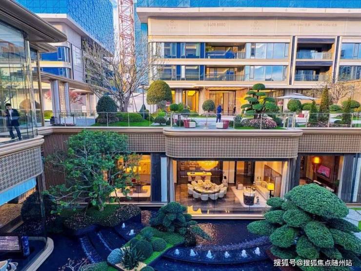 再往里面走,穿过前厅酒店式大堂,就能看到下沉式景观庭院和中央景观水系。景观打造都是以奢华酒店、著名公园为灵感设计。