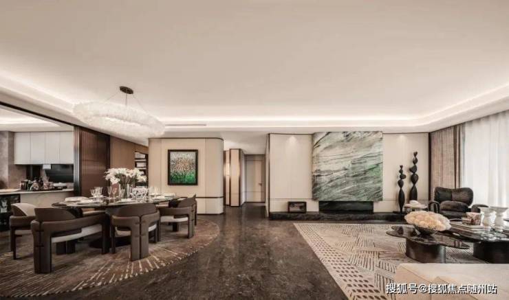 客厅地面臻选拿破仑灰石材(建面约220㎡户型为古堡灰石材),并采用了颇耗工艺成本的密缝连纹技法,地面就像一张完整的艺术画幅,如风如水,浑然天成。