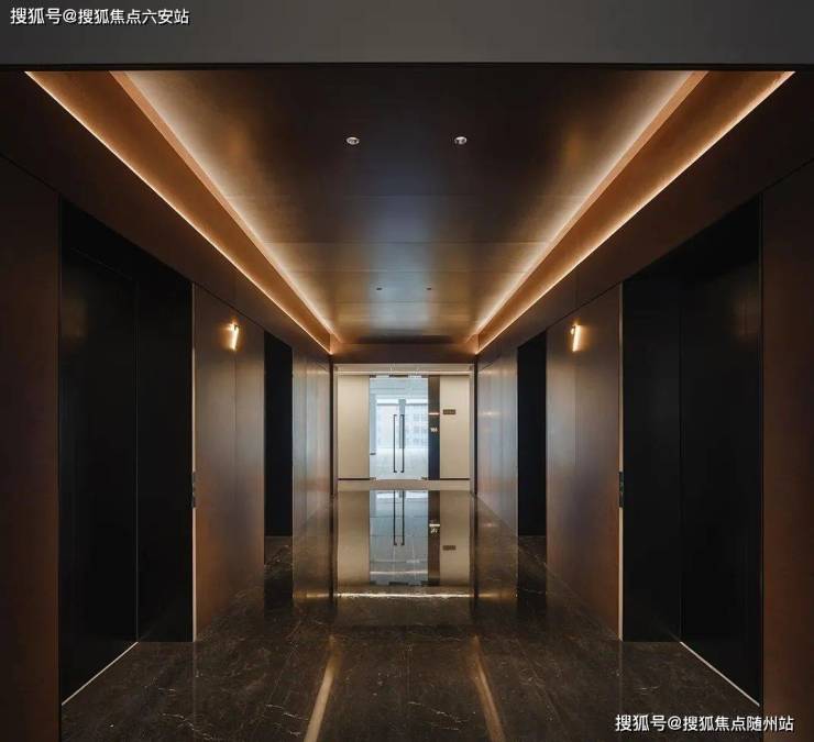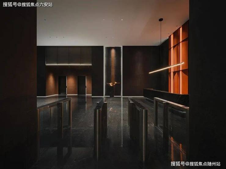 通往高层的电梯入口安排在接待台的右手边,符合行走的第一顺位。挑空的恢弘气质将空间的大气之势拉开帷幕,黑与橙的主色调相融营造了严谨的企业文化气质。近六米高的悬挑空间延伸至电梯厅,内与外空间的规整性与延展性达到了高度的契合。