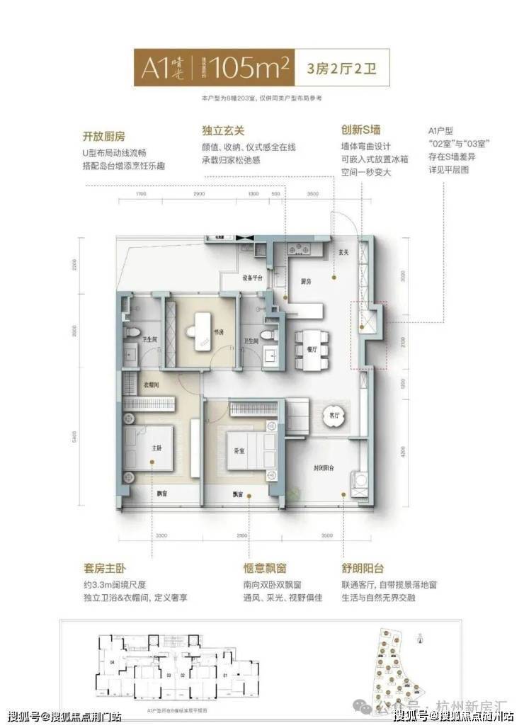 建面约105㎡晴光户型,不仅实现更优面积排布,更做到精神与审美的高度适配。在设计中,这间三房同样拥有南向大面宽,搭配S墙/开放式厨房/一体化餐客厅/多功能书房/酒店套房主卧等,将整个空间的开阔感和互动性做到极致,满足居住者对舒适、安逸的“精准需求”。
