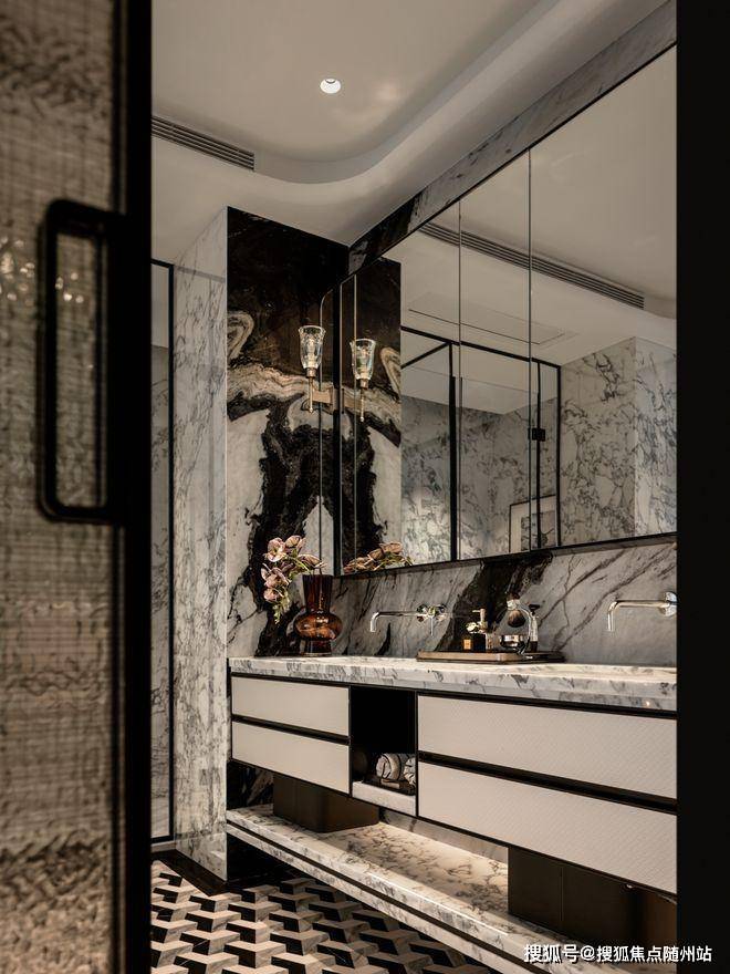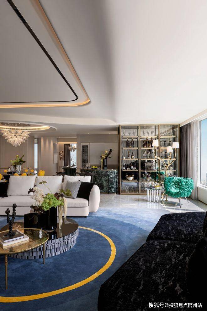 约300㎡“观湖”,谢柯打造;另一款是更宽舒的约412㎡“行云”,出自邱德光。尤其是约412㎡“行云”,无论玄关处雪花白、劳伦黑金、金世纪的大胆拼花,瓦楞式的波浪形电视背景墙,还是吸睛的普拉达绿石材吧台,全屋随处可见出色审美和奢华材质的完美结合。