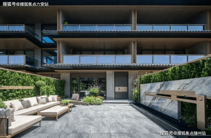 (一)久映颂月府采用备受欢迎的新中式建筑风格,将宋式坡屋顶、挑檐等建筑风韵,通过现代技艺手法完美呈现。在建筑设计中,深入挖掘宋式建筑轻盈、精致、通透的特点,对 “将军门、飞檐、重檐、绞角造、板引檐、普拍枋与阑额、方格挂䈋” 等传统建筑元素进行原创转译设计。项目在建筑外立面上不惜成本,采用伊朗进口的 “蓝眼睛” 石材,这种石材纹理独特、质感上乘,在阳光下散发着迷人的光泽。搭配大面积落地玻璃与香槟色铝板,不仅提升了建筑的整体质感,还增强了建筑的采光与通透感。值得一提的是,北向立面同样采用高品质材料,香槟铝板的包裹让建筑无论从哪个角度看都尽显奢华与精致。