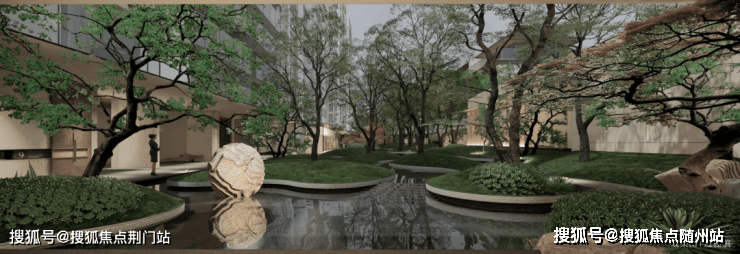设计由北京顺景园林操刀,以“溪山行旅”为叙事主线,打造“归林-观山-临水-栖谷”四重景观序列,中央水景池底镶嵌《溪山行旅图》局部浮雕,实现文化符号的沉浸式植入。