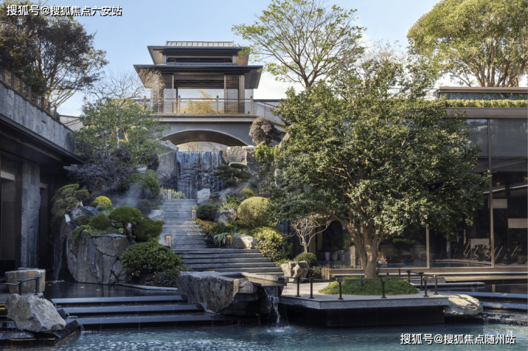 从大门开始,云启钱湾采用隆重的「重檐悬山顶」,门口台阶中间的「水纹御道」和钱江潮涌呼应。