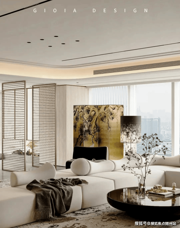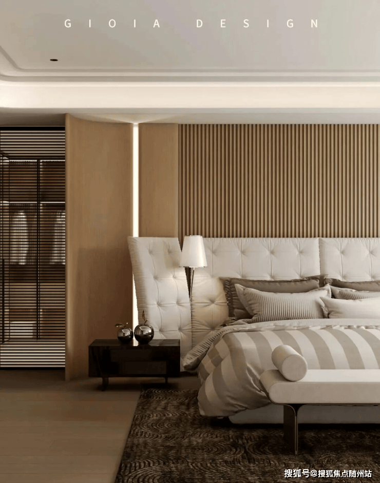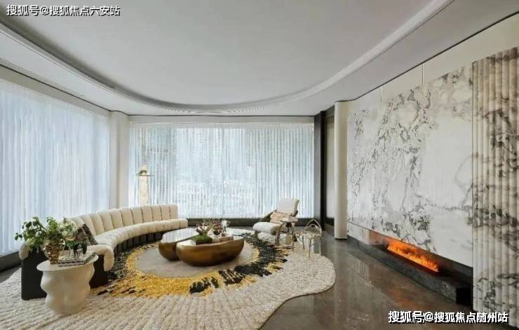 整体设计风格以浅白色为主,客厅背景墙贴着大面积「芬迪白大理石」,弧形的造型配合木饰面,以及酒店级的灯光设计,让整个空间看起来奢华又不失温馨。