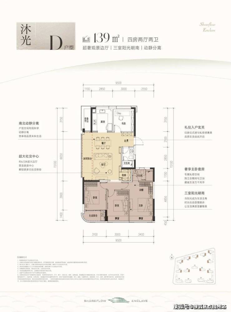建面约139方D户型,四房两厅两卫: