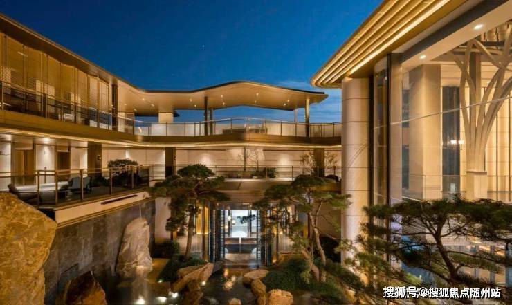 黑松迎宾,太行金石皮摹写山水肌理,开启松间画屏的宁静序章。斗拱、榫卯、拱门、丝织元素转译舒卷归堂的东方美学,穹顶之下,归家即享恢弘妙境。叠石、壑松、理水相映,约15米超尺叠瀑倾泻而下,以“银河叠水”奇观展现动态的《溪山行旅图》意境。下沉茶室静对流水,独拥“月映听泉”之幽。