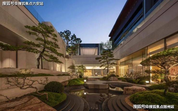 「松川境」的门庭灵感,藏于宋画传世之作《松阁观潮图》约80米长的礼仪门庭,特选名贵黑松,与共约25米长的叠级水景虚实相生。