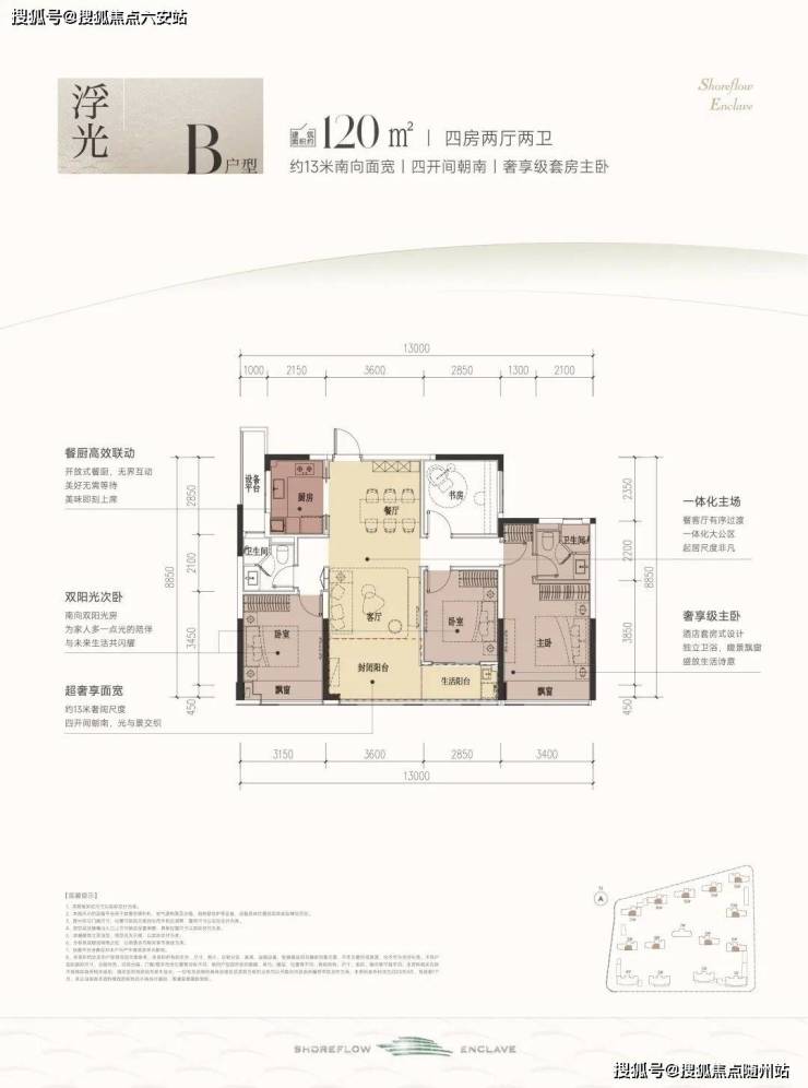 这款户型堪称四开间朝南的“流量王者”,南向面宽约13米,双联阳台+双飘窗设计,视野和采光优秀;套房主卧、双阳光次卧,颇有大平层的气势。