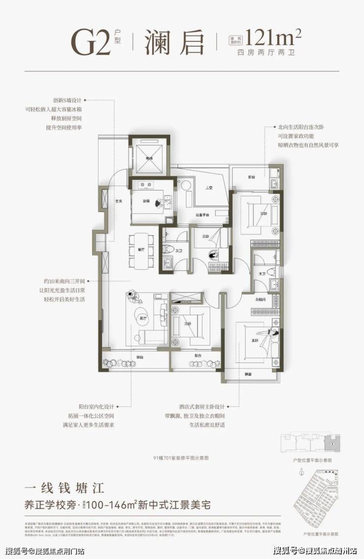 建面约146㎡的四房户型,全部南向面江,大部分楼层还可看到一线江景,是无数人心中的梦中情房。“类一梯一户”设计,私密性更好。其中横版四开间朝南+大方厅,一线南向面江,室内采光充足,视野开阔;竖版大边厅设计,主卧带有超长转角飘窗,可大尺度无死角欣赏钱塘江景。