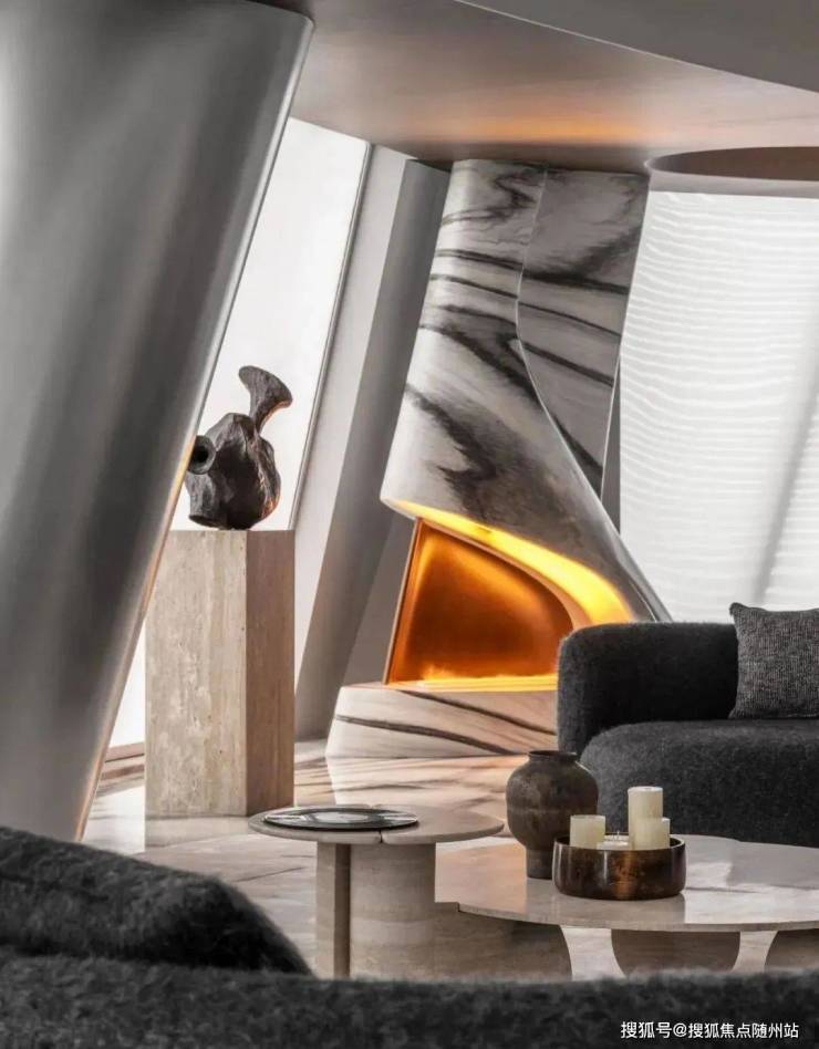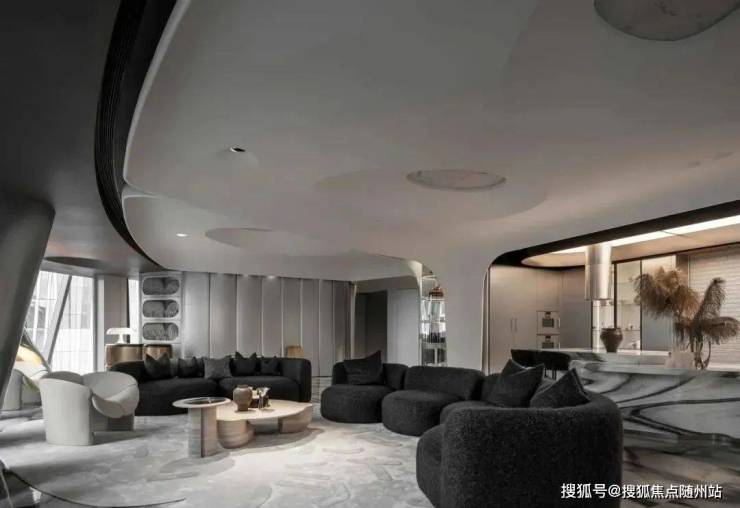 偶然、随机、浑然天成……像自然界的万物一般,室内空间受某种“牵引力”的作用自发生长,墙体交错蜿蜒,天花随之流动。马海毛沙发、洞石茶几、四叶草般沙发椅……