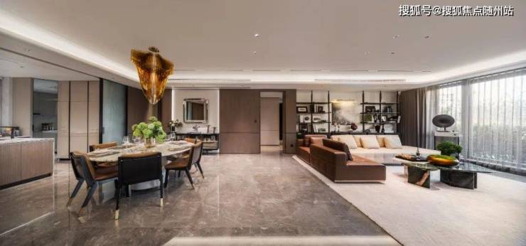 餐客厅LDBK一体化的设计,南向开间达到了约5.9米,南侧超大的落地玻璃窗仿佛一个天然取景器,将湖景“迎”入室内,采光、视野无敌。