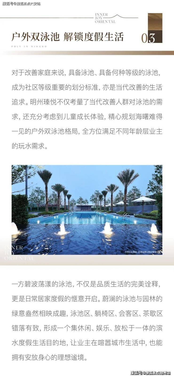 保利发展宁波悦系首作,传承了千载明州的文化底蕴。项目内自带户外大型游泳池和观星躺椅,仿若置身于海岛度假村,每一天都是一场属于自己的仪式感。