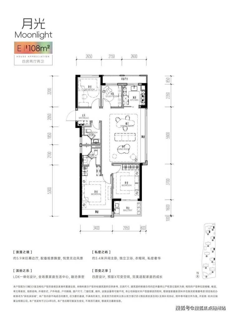 还有建面约108方东边套户型,做到了同级少有的4房2卫巨幕客厅设计。