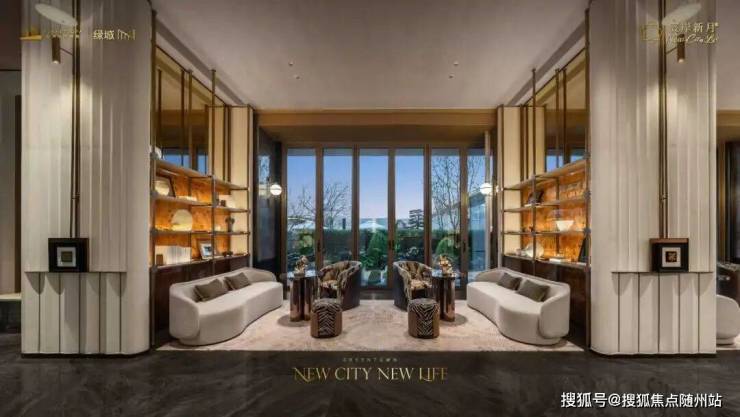 Logo转译石材地面拼花,金属晕染的接待台在璀璨的水晶屏风映衬下,熠熠生辉。目光透过屏风,开启“窥园模式”,超大落地窗将水景庭院直接框成动态壁纸。