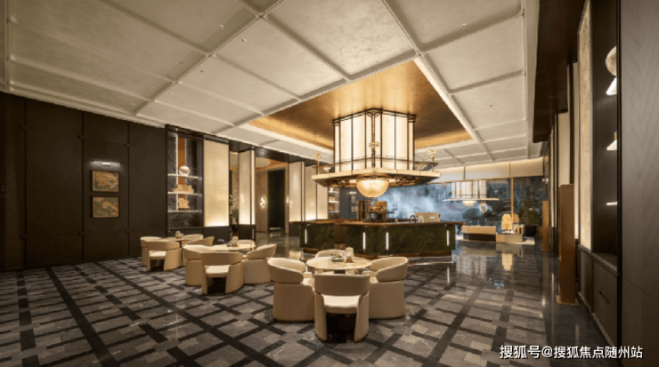 归家大堂的穹顶承袭了皇家宫殿藻井形制,采用非遗“泥金彩漆”工艺,手工逐寸贴金,金辉流转,如星河垂落。中央圆环吊灯取意“礼玉”,寓意天圆地方,“敬天礼地之思”凝练于此。地面则采用了香格里拉、普鲁士澜、莱卡灰三种奢石水刀拼花而成。