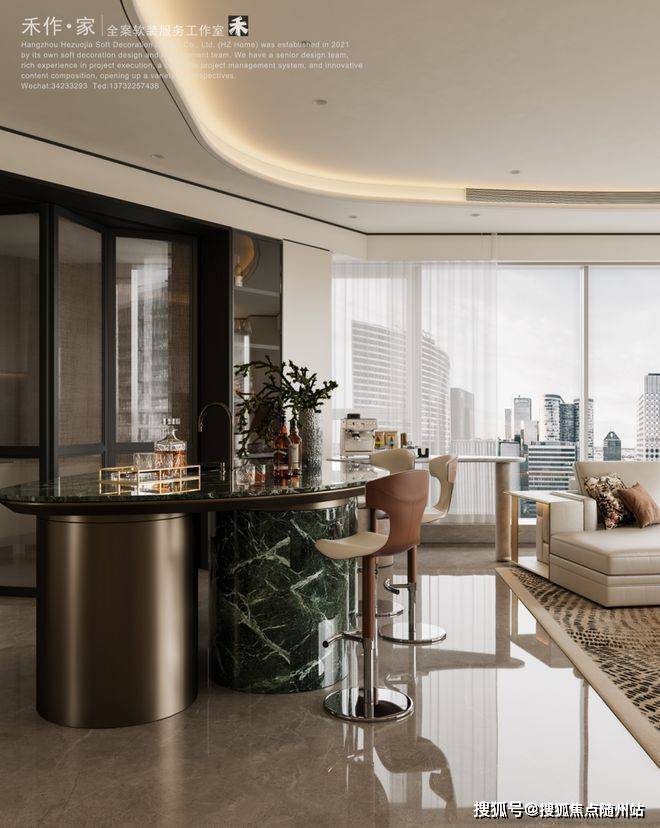 建筑设计:采用大面积玻璃、约270°全景落地窗,搭配奢品石材,打造高品质生活空间;建筑立面采用银白、深灰色材料,远观如逐渐消融在天空中的艺术品。