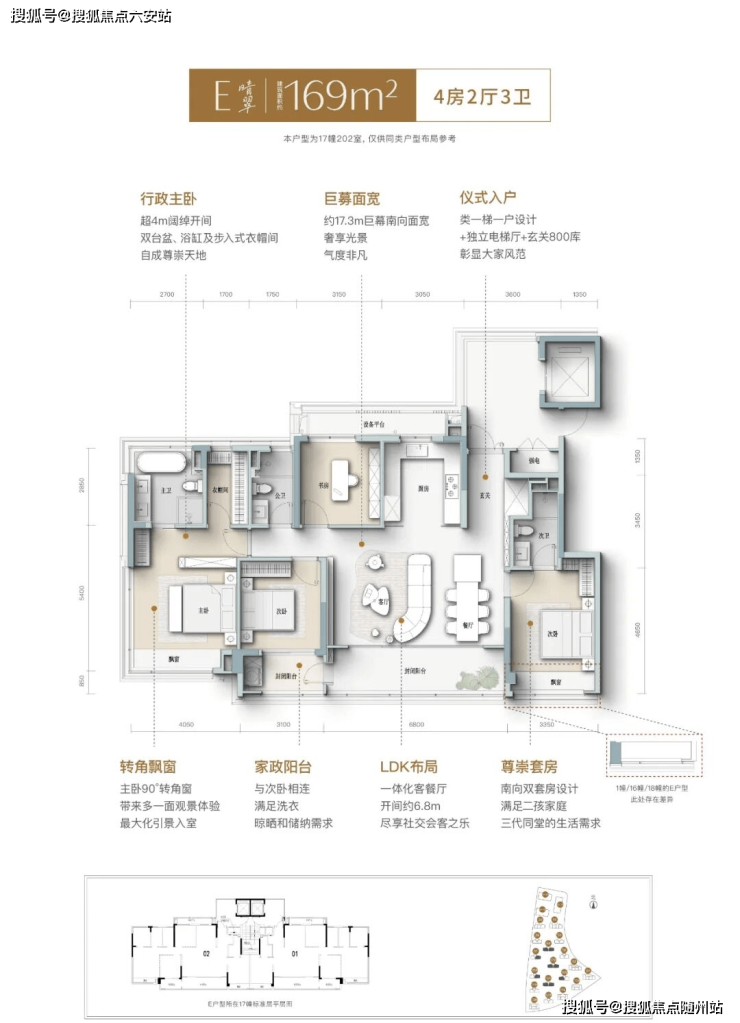 当然有钱就直接上169㎡了,半楼王位置,17.3米的南向面宽,几乎没啥可挑剔的。