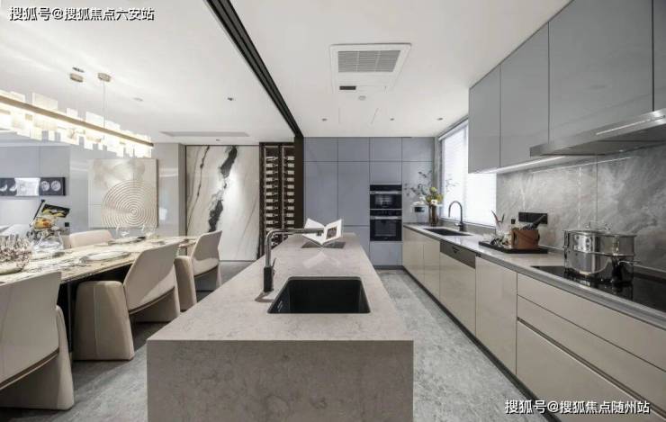 而在餐厅处,精心挑选整面熊猫白奢石,增添整体色彩的多样性,雅奢中不失灵动;厨房中西厨岛台设计,并在中岛处配置自动升降插座,大U型动线,功能非常强大;冰箱、洗碗机、烤箱、蒸箱等一线德国米勒品牌,让每一次烹饪,都极具品味和优雅。