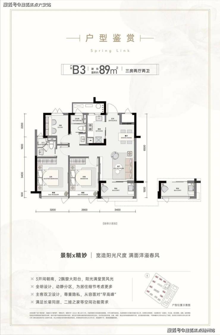 建面约71㎡的两房户型将开放式厨房与泛客厅相连,从餐厨、客厅到阳台形成通透空间。而建面约89㎡的三房户型,三开间朝南,设计出了两条平行生活动线,巧妙地形成了一家人共聚的公区,以及由主卧、套卫、书房的“第二客厅”。