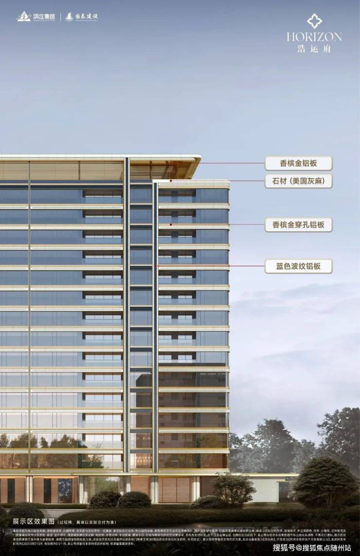 立面以金属铝板勾线,描摹世家风骨,搭配大面积玻璃幕墙,渲染出“浩运金”与“钱塘蓝”两大主色调。