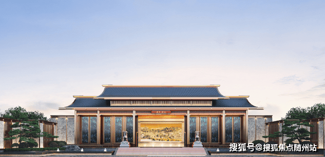 立面形制以借鉴宋皇室《仙山楼阁图》《瑞鹤图》中建筑要素为灵感,并以沧浪亭中明道堂为基础。采用重檐坡屋顶,五间一启形制,庄重不失克制。七阶入门,象征尊贵寓意圆满。门楣大师墨宝,门内非遗漆画姑苏繁华图,再现金阊的富贵之景