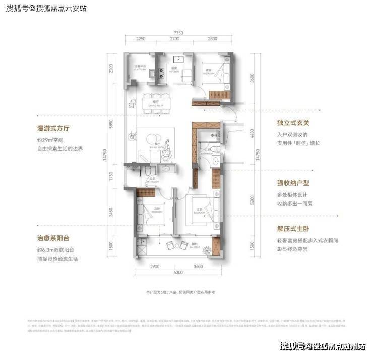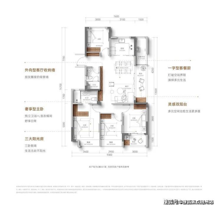 三房朝南,面宽约9.3米,户型设计双阳台双飘窗,能完美地将生活与休闲功能分隔开;主卧套房设计,尺度宽绰,带步入式衣帽间,处处彰显改善盘的空间感。
