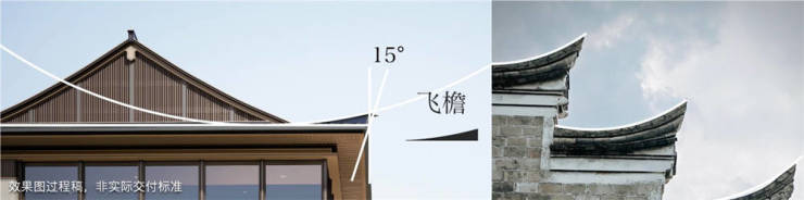 整体以“中国屋檐”作为核心设计元素,除了鱼鳞瓦、悬鱼等经典元素外,用现代手法将宋代用于官宅的歇山顶演绎尊崇,每一户的屋面和檐口结合风水做了多种变化,错落有致,户户私属。