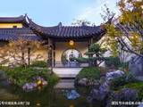 穿过铜门,进入接待大厅,透过一片落地玻璃窗,一幅园林画卷徐徐展开——叠水佳石、立体游廊,曲折尽致,颇具园林逸趣。