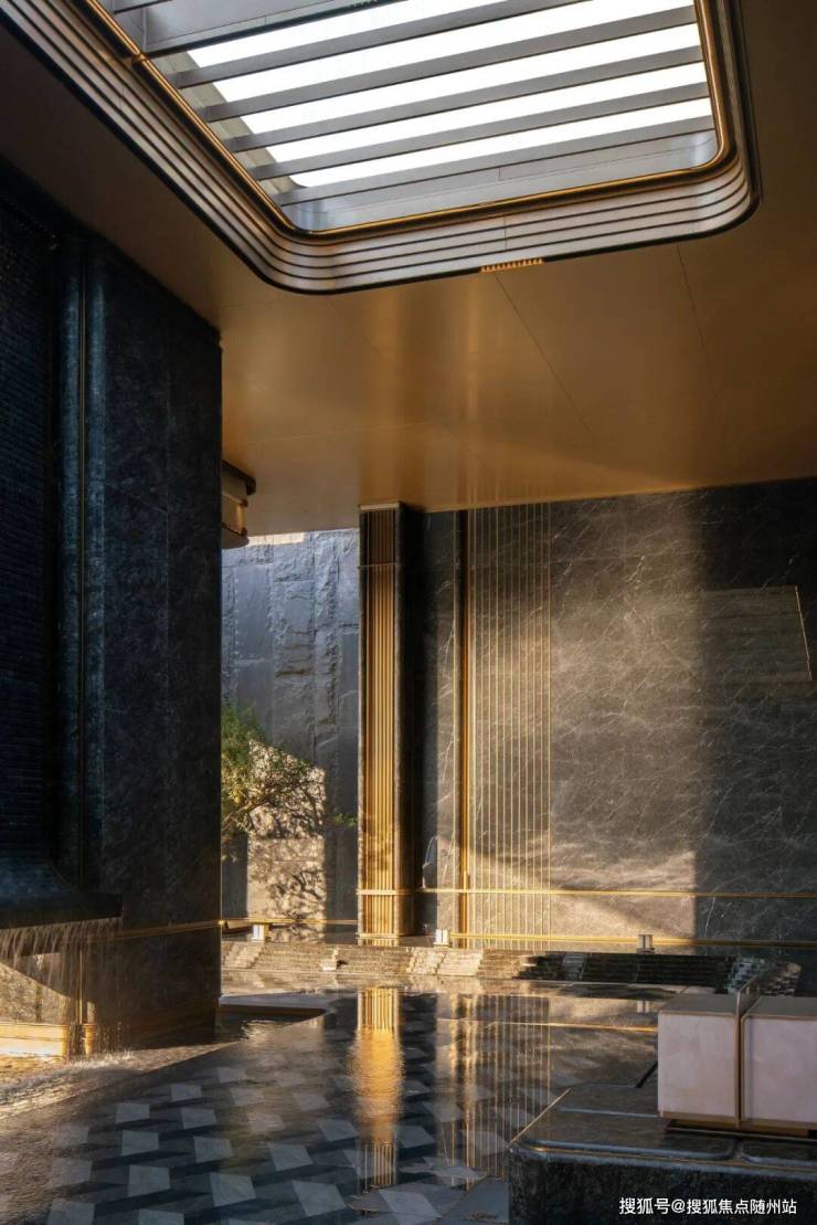 主入口空间向内退让,形成有温度的城市边界。52m超长门头水平横向舒展,既遵循中轴对称的传统礼仪范式,又以简约线条、奢华材质与极致工艺呈现艺术、轻盈的雅奢格调。前场庭院以“洄游”为理念,重构“四水归堂”的空间序列。