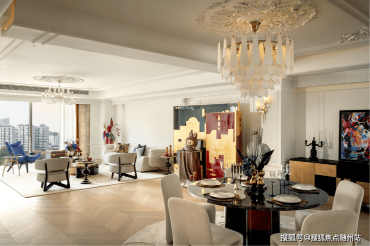 中间套的客餐厅更是达到约100㎡,一张12人的大圆桌也有充足的空间优雅转身。周末约上好友来聚会,给主人赚够了颜面。