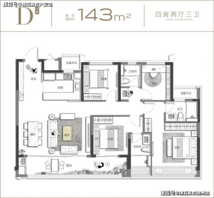 约143㎡改善断货王:143户型的空间尺度,做到 丝毫不逊色于市面上的160方以上户型。整体四房两厅三卫设计,户户南向双奢适套房,给予自己与家人更细致的关照;三大全明卫浴空间,将舒居哲学演绎到极致;约14.55m现象级面宽,以风景与阳光丰盈生活的每一个日常;约6米巨幕横厅,则深刻考量家庭互动、瞰景休憩、社交待客等需求,超级尺度盛纳万般美好。