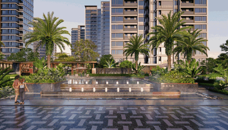 置身景观廊架之下,纵眼望去,东南亚棕榈科植物阵列其间, 约 183.5㎡ 亲子戏水池、酒店感礼仪水景相映成趣,绿荫草木、天光云影倒映于缓缓流动的水面上,宛若一幅立体的江山画卷,流动生活的无尽遐思。