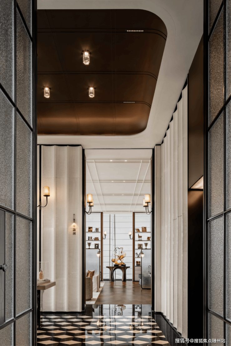 走廊的墙面材质十分优雅,壁灯照亮细节,玻璃幕墙增加光线的通道,细节点缀奢华。