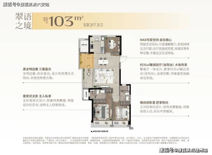 建面约103㎡的边套更是堪称神迹,将小户型的空间魔法玩到了极致。客厅到阳台的地面、天花直接拉通,甚至两侧的墙垛都已隐身,整个餐客厅面积达到约35㎡(含阳台),这可是140㎡以上大宅才有的空间感!