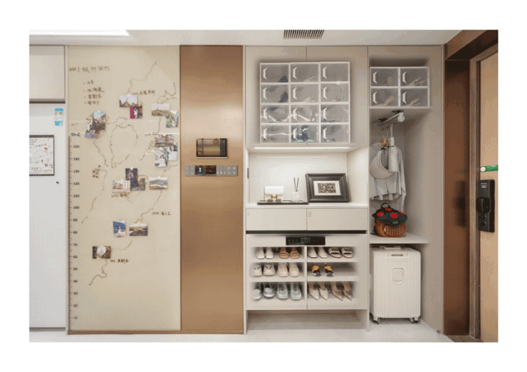 全家人的出入全能仓,扩大鞋柜容量,增设挂衣区、行李仓,贴心的归家置物格,便捷每一次出行与归家。