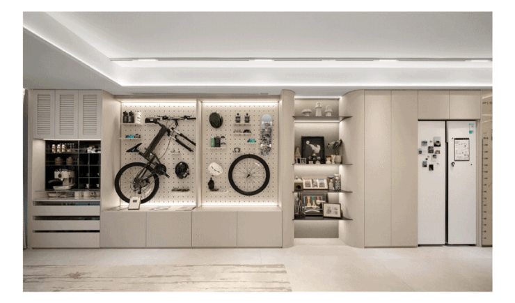 润樾4.0摒弃传统电视背景墙做法,打造了一面通顶巨量收纳墙,一面墙即是一个超级收纳场域,让业主尽情展现生活志趣与独特品味。