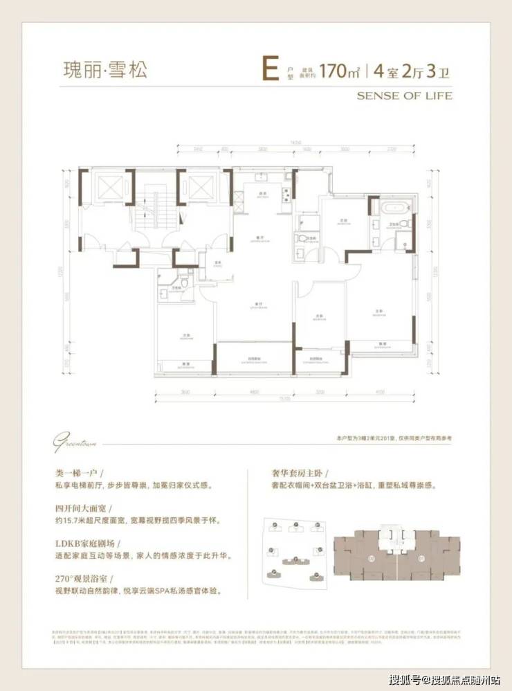 建面约170方户型实现“主卧小家化”,奢华套房式主卧,奢配衣帽间+双台盆卫浴+浴缸,同时配有大飘窗,采光和景观面不输大客厅。