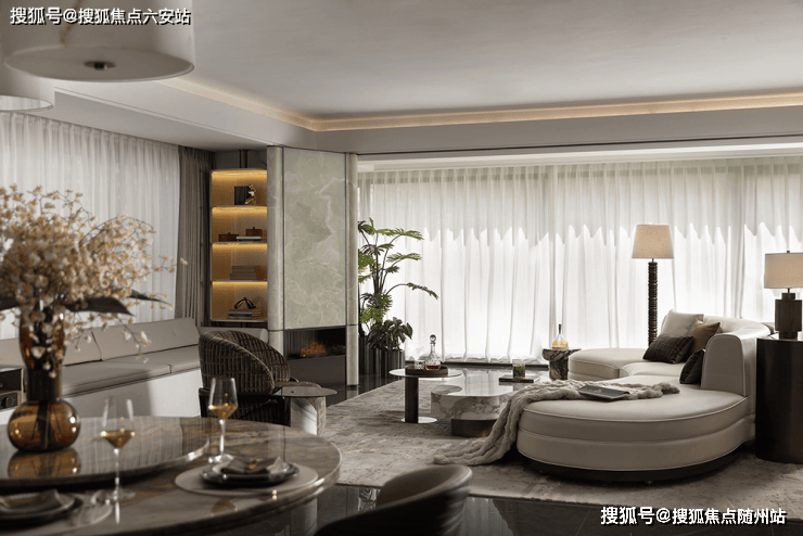 仪式感设计:五星级环岛落客区、约9米高超尺度珠帘水幕墙、约8.5米高酒店式入户大堂,以水、景交融打破空间界限,营造“高定生活”的仪式感——归家即度假,每一次进门都是尊崇礼遇。