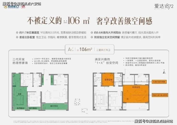 **建面约106㎡**:LDKB一体化设计,3.5南向开间+双明卫,预留“1+X”创变空间,年轻家庭首选。