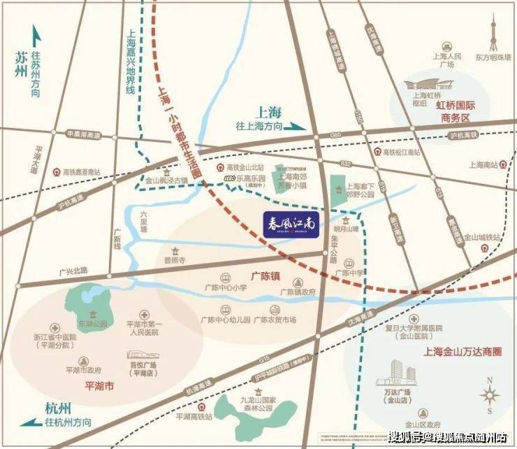 春风江南坐落于嘉兴平湖广陈镇,与上海仅一河之隔,距离东方明珠约63公里,是距离上海最近的蓝城田园小镇之一。