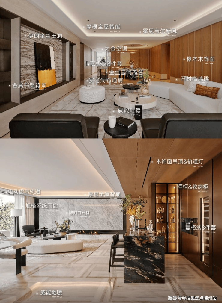 室内精装,安璞延续温暖极简主义,石材背景墙、摩根智能家居系统、嘉格纳8件套、陀飞轮的灯光操控面板、Poliform定制衣柜(主卧)、厨房独立大金空调、旭格系统门窗(部分)、全卧室(书房)采用工艺繁复的实木拼花地板等,严谨而有序地组合成安璞的内在品质。