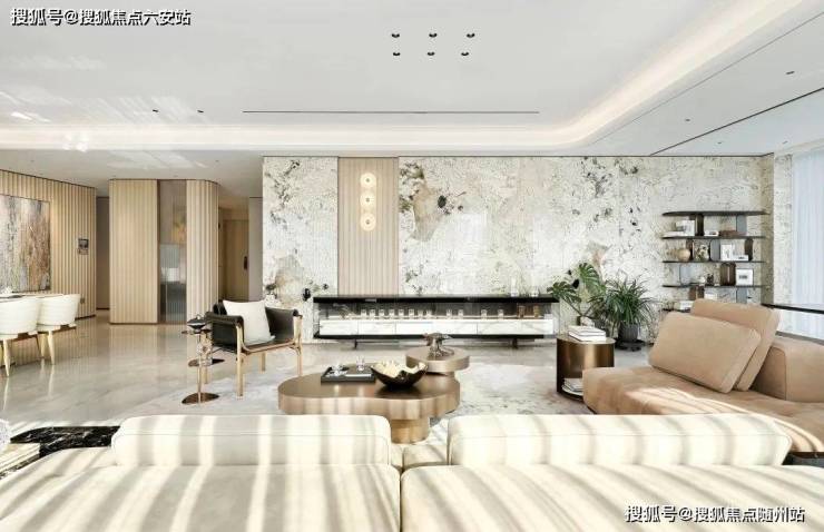 户型特色:公区方厅建筑面积超 90㎡,南向开间约 19 米,尺度奢华;整体设计风格以浅白色为主,客厅背景墙贴着大面积芬迪白大理石,弧形造型配合木饰面以及酒店级的灯光设计,奢华又不失温馨。