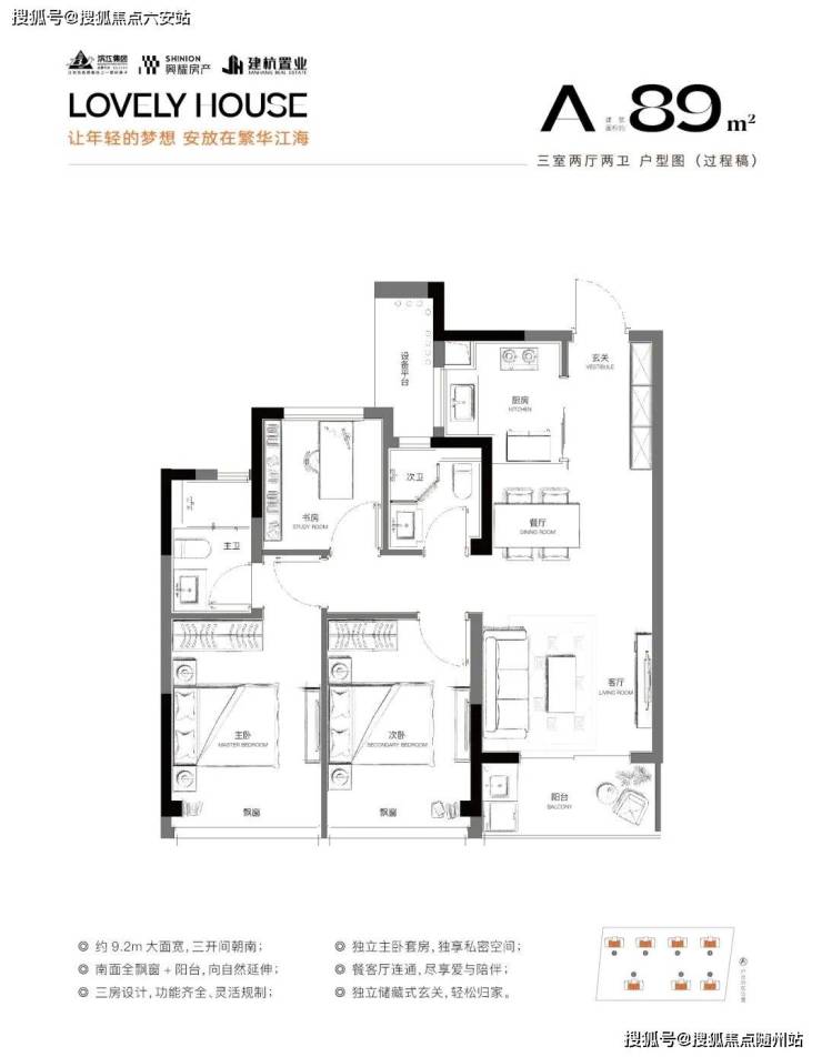 - **爆款89㎡三房两卫**:三开间朝南+9.2米面宽,独立主卧套房+走入式衣帽间,得房率超85%,总价156万起,首付仅24万。