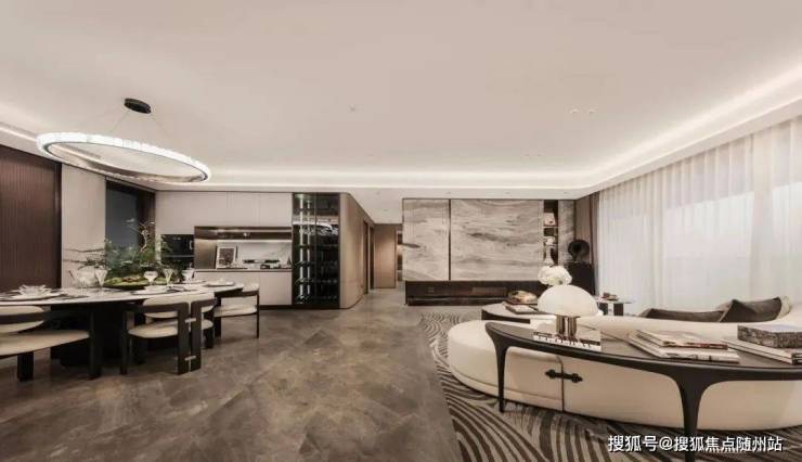 如建筑面积约260㎡的户型,餐客厅之间打造了一座可移动的中岛台,甚至还精心配备了电动轨道,自行控制推出距离,搭配高脚凳,非常符合人体动学。