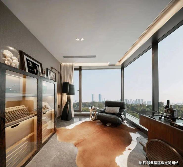 建筑面积约350平米的独层独户,南向面宽达到约25米,客厅的公区做了270度的大面幅转角窗,将鲜活的城市夜景最大限度地做成居家背景。