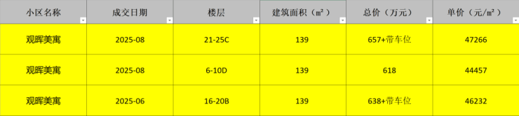 另外,对比杨家墩附近的次新二手房——滨江观晖美寓,今年4月交付至今已成交17套,其中139㎡共成交3套,二手价格同样4.5-4.6万/平,总价620万+。