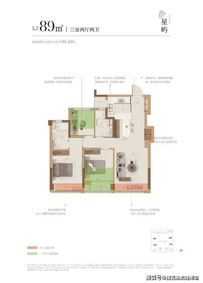 最大约100%得房率、迭代升级户型,89㎡-104㎡三房甄选作品115㎡-132㎡四房改善作品